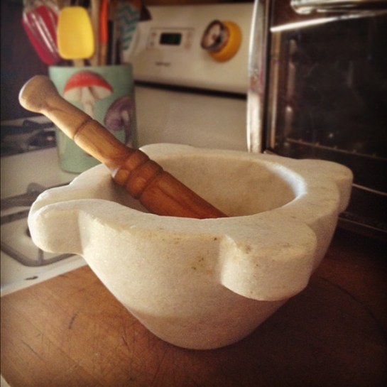 You may have picked up that I’m passionate about pestles and mortars. I can’t remember when I got my first one but I have been grinding spices and making vinaigrettes and mayos and aiolis and pesto in one or another since I started cooking. There’s something very satisfying about pounding and turning and watching your creation slowly come to life before you.
