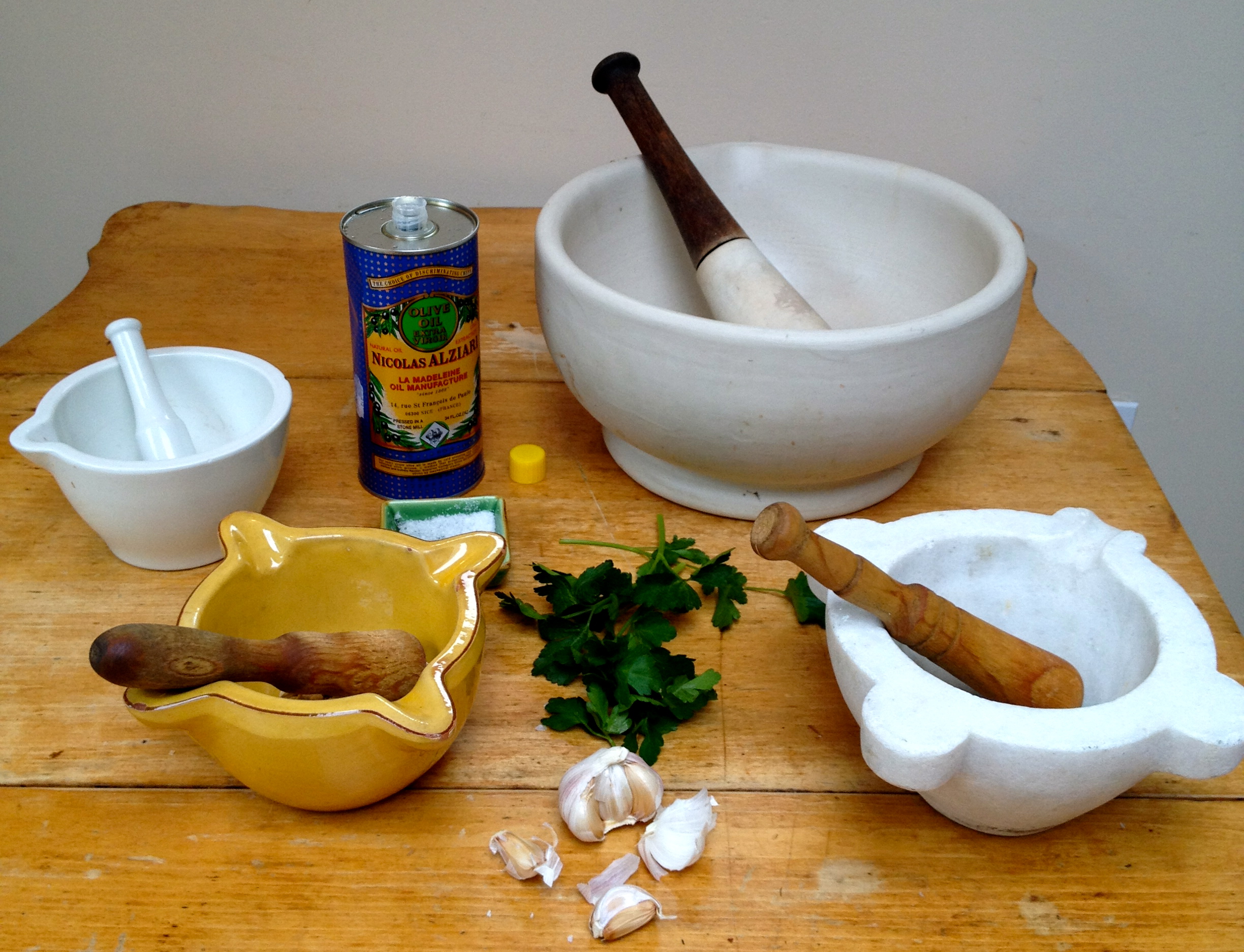 Here is a picture of some of my p&m’s (I have more at our home in France). The biggest one I acquired when we were living in London in 1990. I was at the Bermondsey Market one Friday shopping for antiques with a couple of friends when I came upon it in all its grandeur and beauty. I did not stop for a moment to consider what I might use it for, nor did I consider what it might weigh (just shy of 40 lbs). I had to have it.