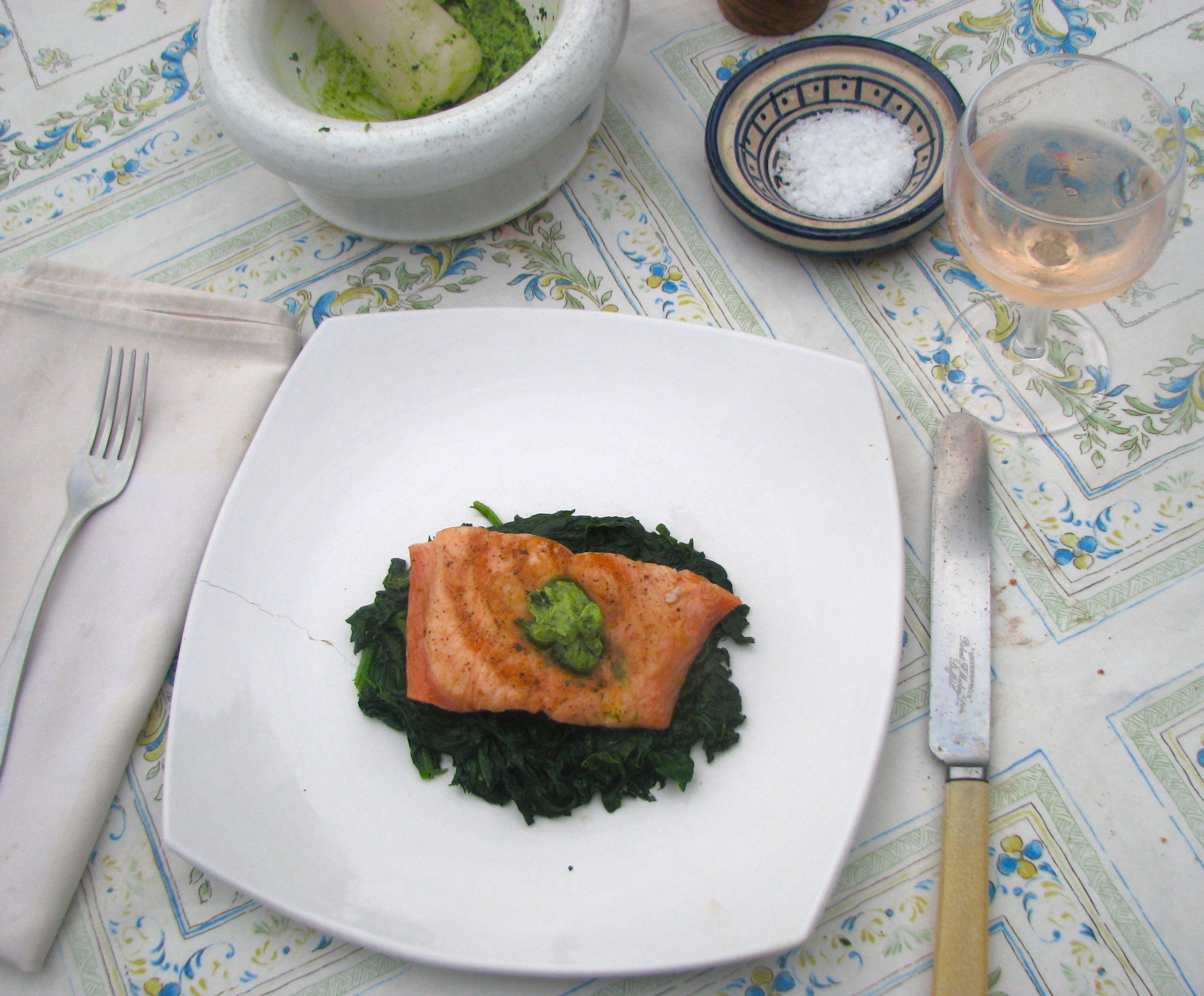 Cover the dish tightly with foil and bake it in a 350 degree oven for 35 to 45 minutes depending on the size of the fish. You should check it regularly after 30 minutes so you don’t overcook it. Insert a knife close to the bone to make sure the flesh is firm and the juices run clear.