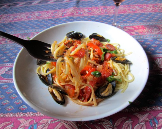Put the tomatoes and basil in a bowl to which you can add the cooked pasta. Make a vinaigrette: Pound the garlic clove with a teaspoon of salt in a pestle and mortar (or bowl if you don’t have one). Add the vinegar, olive oil and pepper and stir to combine. Pour over the tomatoes and mix thoroughly. Soften the goat cheese by whipping it with a fork so that it will melt into the sauce. If it still seems stiff, add a teaspoon of cream or milk.