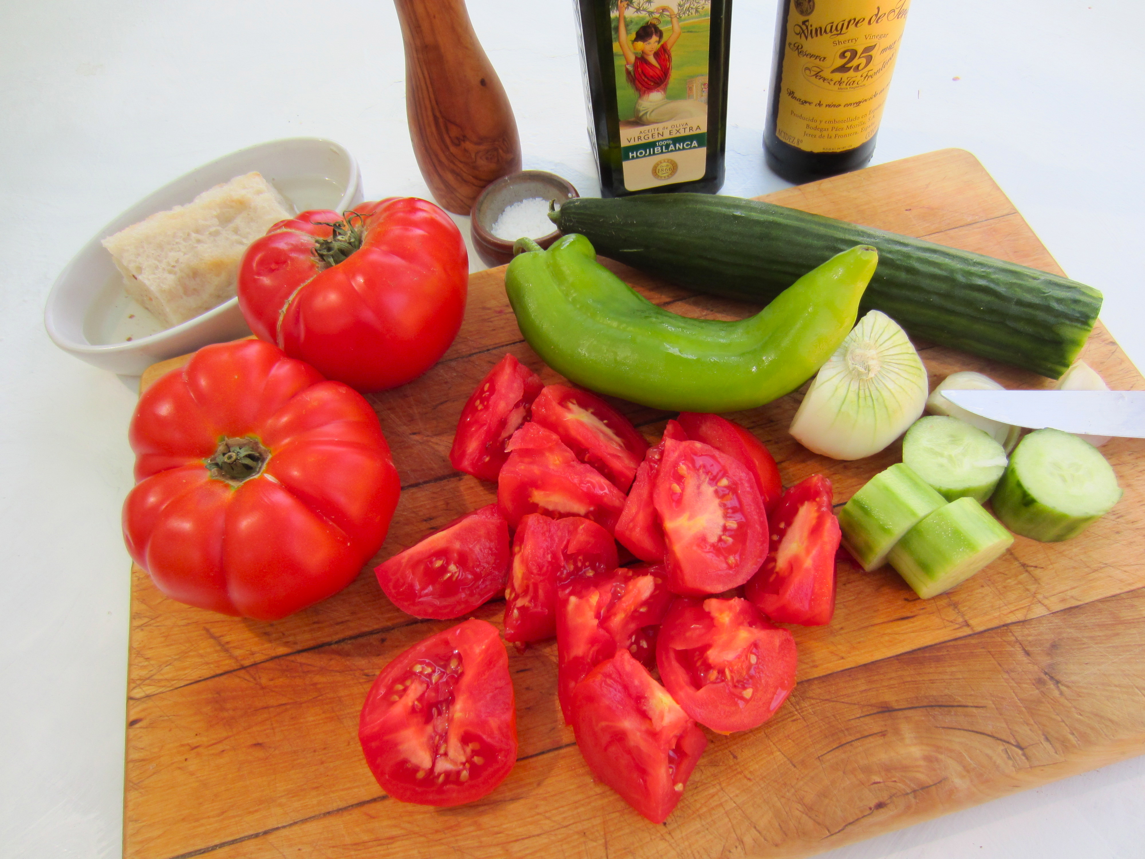 First of all, it should be made of top flight ingredients – ripe, summer-sweet tomatoes, stale crusty bread (Tuscan unsalted if you happen to live in Tuscany), mild red onion, your very best olive oil and vinegar, salt and pepper and a sprinkling of fresh basil. That’s it. Well, some chopped cucumber and a little garlic won’t hurt but any of the other ingredients listed above are strictly taboo, at least in our household. We also don’t like to soak the bread in water as it makes it mushy. Better to add it directly to the bowl with the other ingredients, toss it around and it will absorb the tomato juices, oil, and vinegar while retaining some of its chewiness.