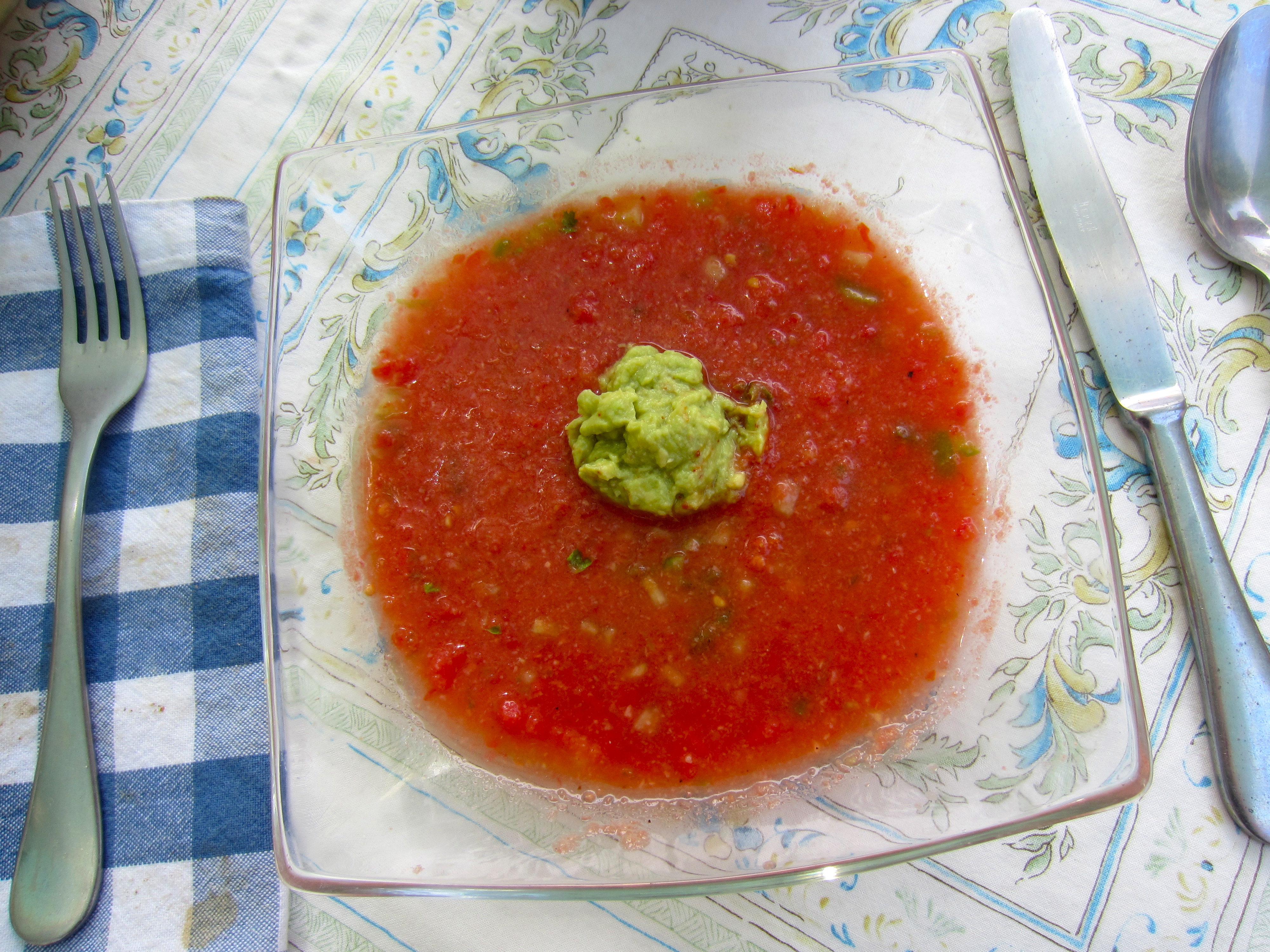 Plunge the tomatoes into boiling water for a minute, drain, rinse in cold water and peel. Chop them up roughly and puree them in the food processor, leaving a bit of texture. Add the rest of the ingredients and pulse a few times to combine, then add salt and pepper to taste. Chill well and serve. This is a wonderfully rich soup. Don’t leave out the ham – surprisingly, most people think it tastes like crab.