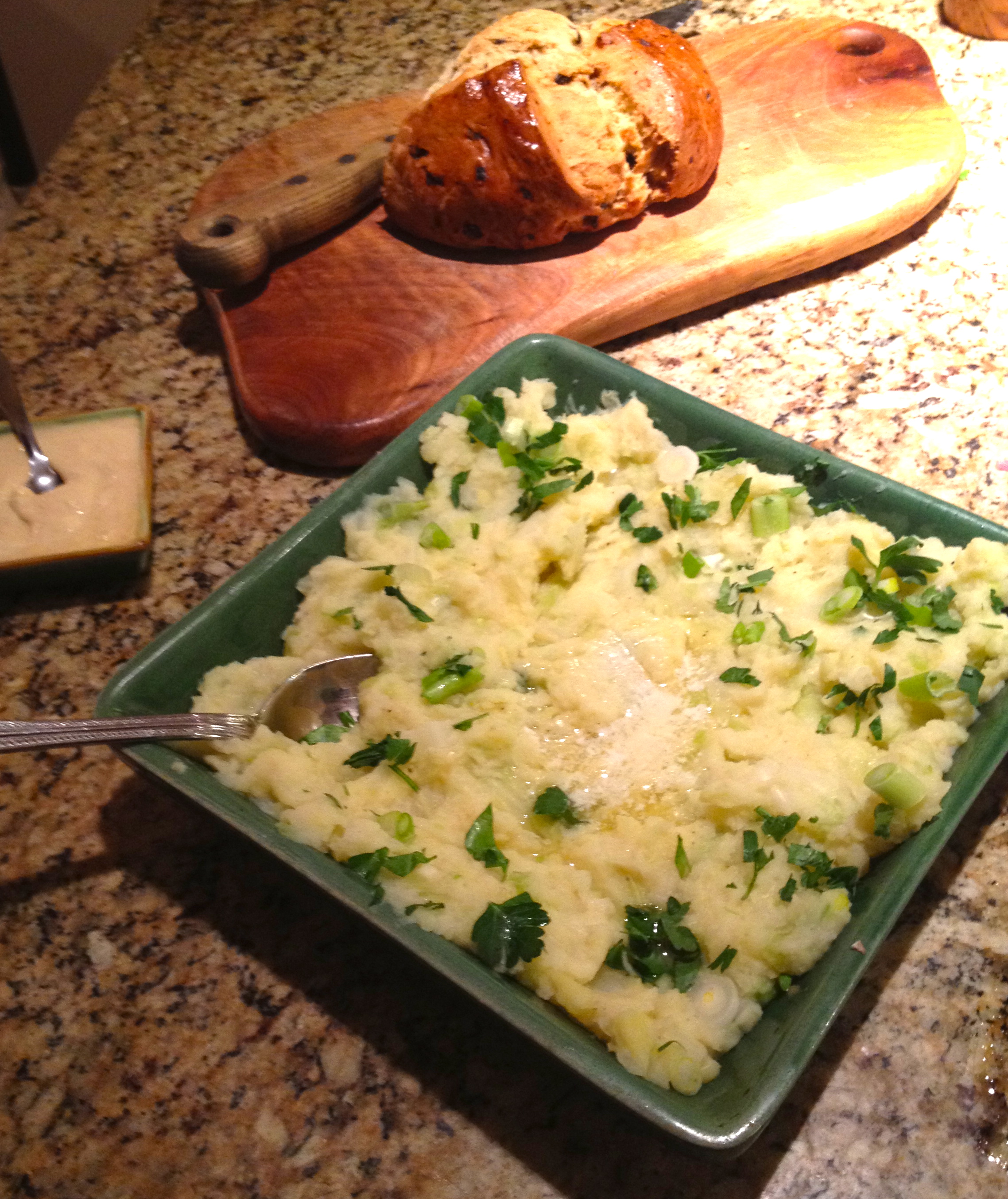 One of the unfortunate things about blogging is that if you’re making a dish for a special occasion and want to photograph it, you either have to make it ahead and reheat it or else post it when it’s too late for anyone checking the blog to be inspired. So maybe you want to cook corn beef at a time other than St. Patrick’s day or else remember the colcannon and soup when it comes around next year.